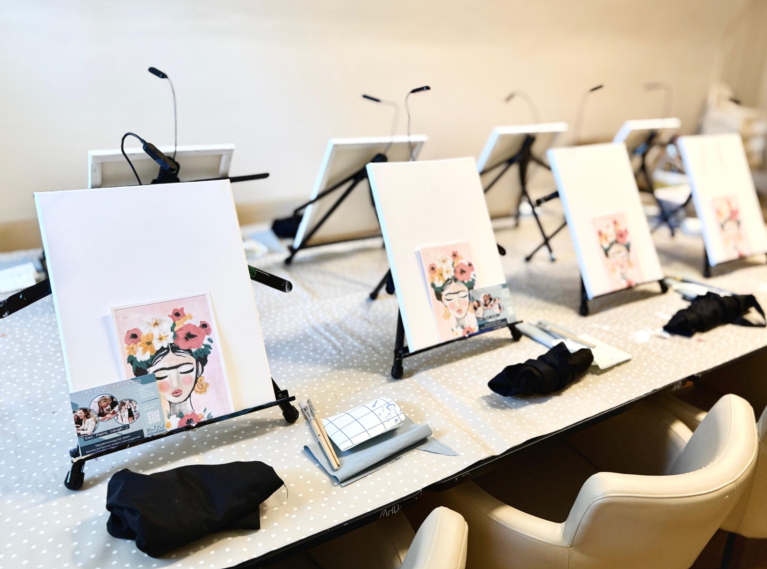 Mobile Painting bedeutet, das Mal-Equipment kann praktisch überall aufgebaut werden. Auch arbeiten ich mit Locations zusammen, sodass ich für euer Event sicher das richtige Setting finde. Indoor und auch Outdoor – sogar mit Verleih von Möbeln. Vor Ort dauert der Auf- und Abbau ca. 30-45 Minuten.
